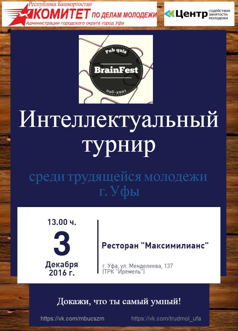 Если ты молод, умен и эрудирован, то не упусти свой шанс проверить свои знания, приняв участие в интеллектуальном турнире, который состоится 3 декабря 2016 г. в ресторане «Максимилианс», расположенном по адресу: г. Уфа, ул. Менделеева, 137, ТРК «Иремель» (12.00 ч. – регистрация участников; 13.00 ч. – открытие, начало игры).
