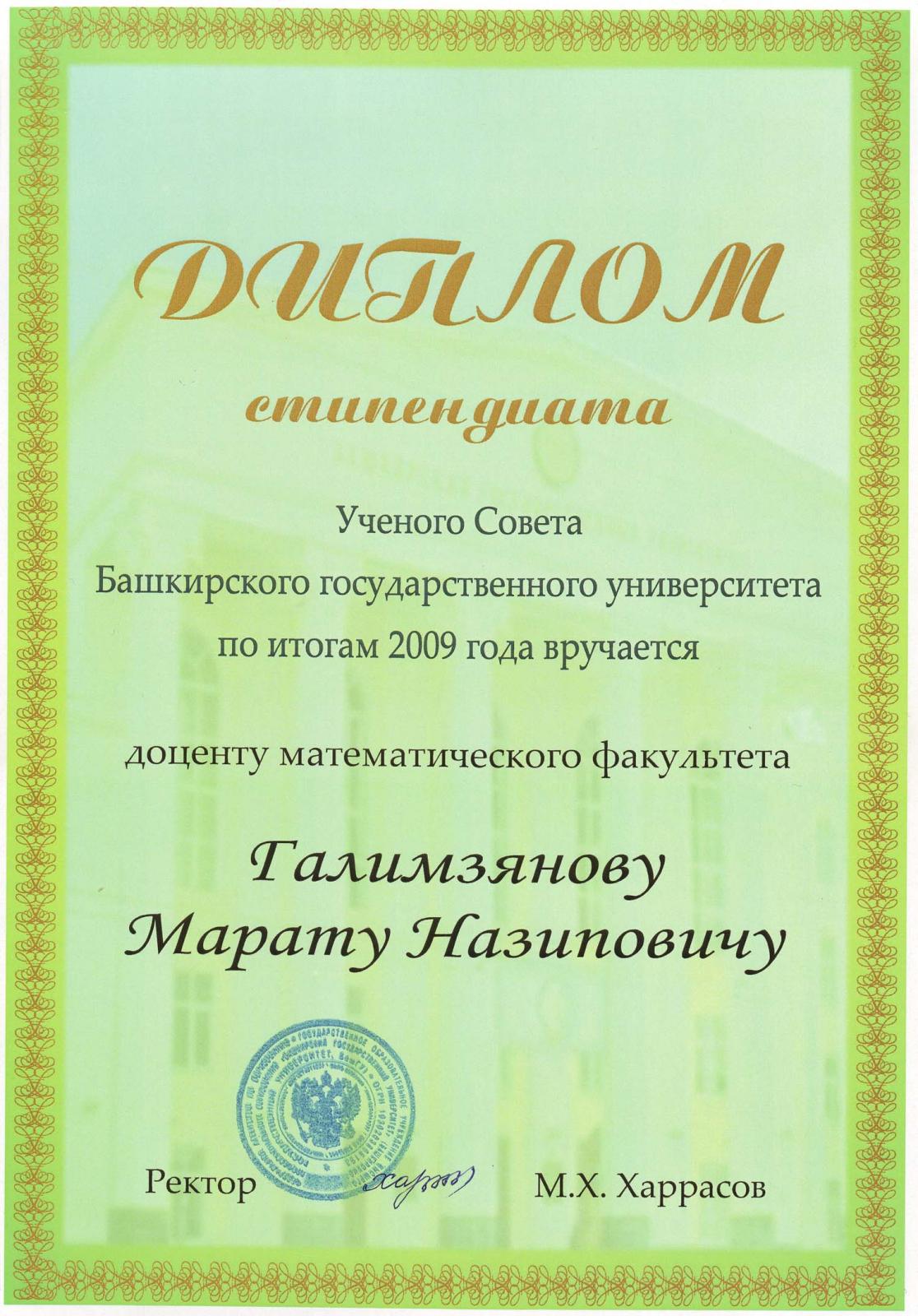 Поздравляем Галимзянова Марата Назиповича с получением Стипендии Ученого Совета Башкирского государственного университета по итогам 2009 года