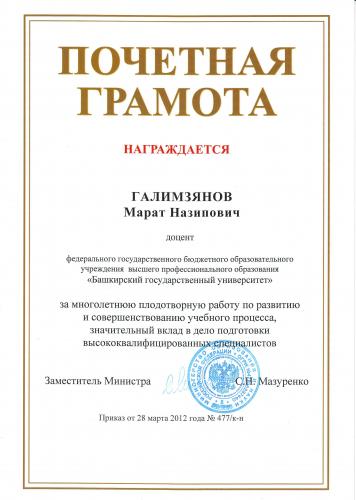 Поздравляем Галимзянова Марата Назиповича с награждением Почетной грамотой Министерства образования и науки Российской Федерации (Приказ от 28 марта 2012 года №477/к-н)