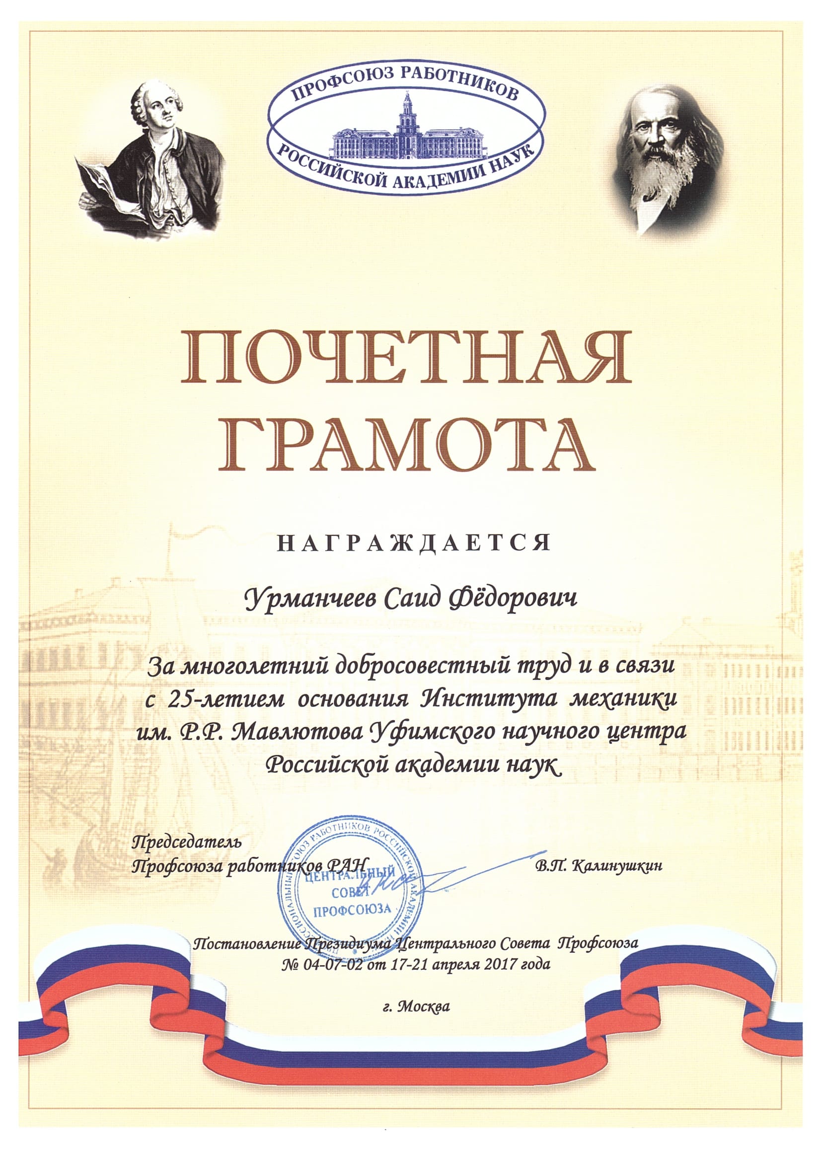 Поздравляем Урманчеева Саида Федоровича с награждением Почетной грамотой Профсоюза работников Российской академии наук (Постановление Президиума Центрального Совета Профсоюза №04-07-02 от 17-21 апреля 2017 года)