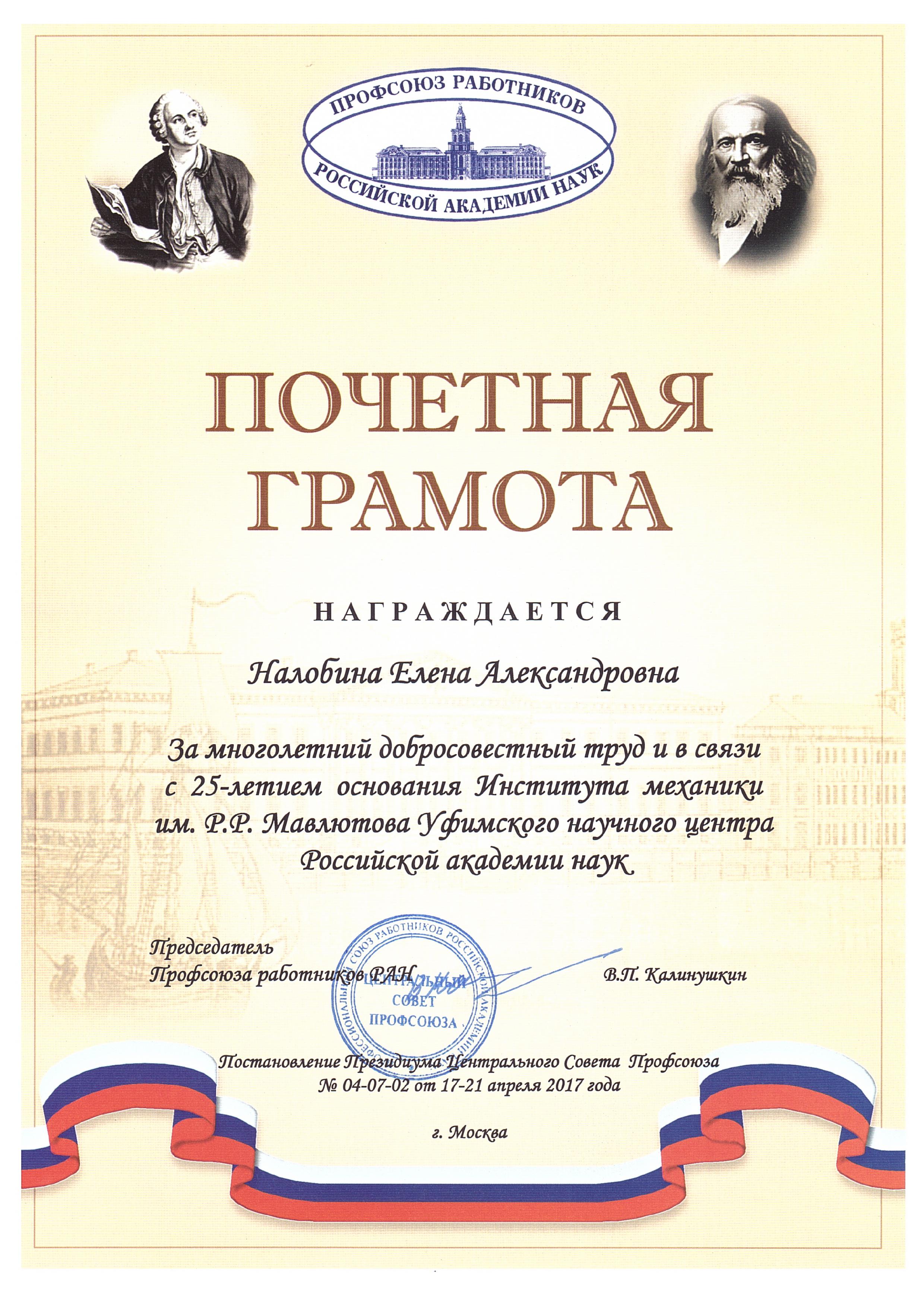 Поздравляем Налобину Елену Александровну с награждением Почетной грамотой Профсоюза работников Российской академии наук (Постановление Президиума Центрального Совета Профсоюза №04-07-02 от 17-21 апреля 2017 года)