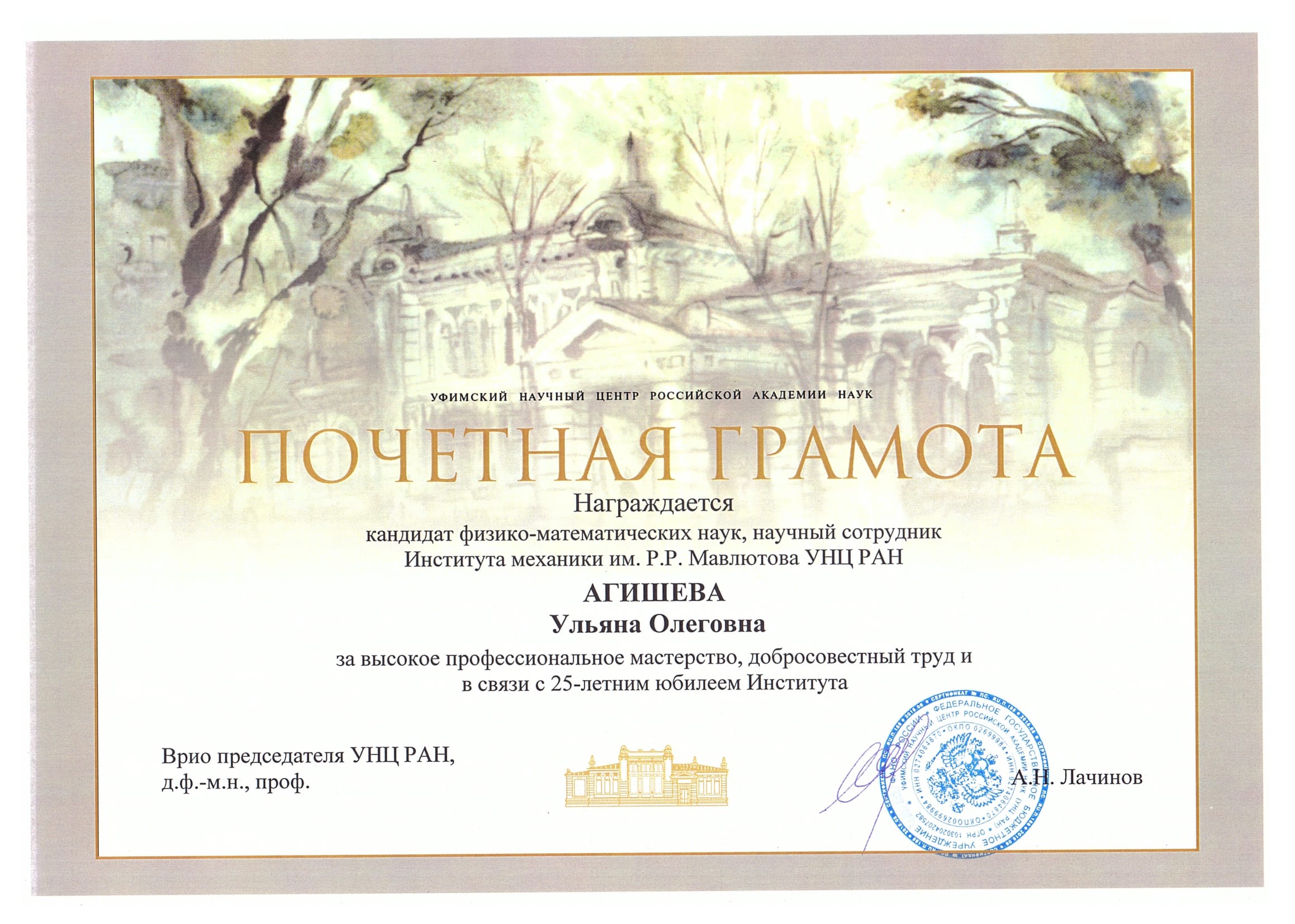 Поздравляем Агишеву Ульяну Олеговну с награждением Почетной грамотой Уфимского научного центра Российской академии наук (от 31 мая 2017 года)