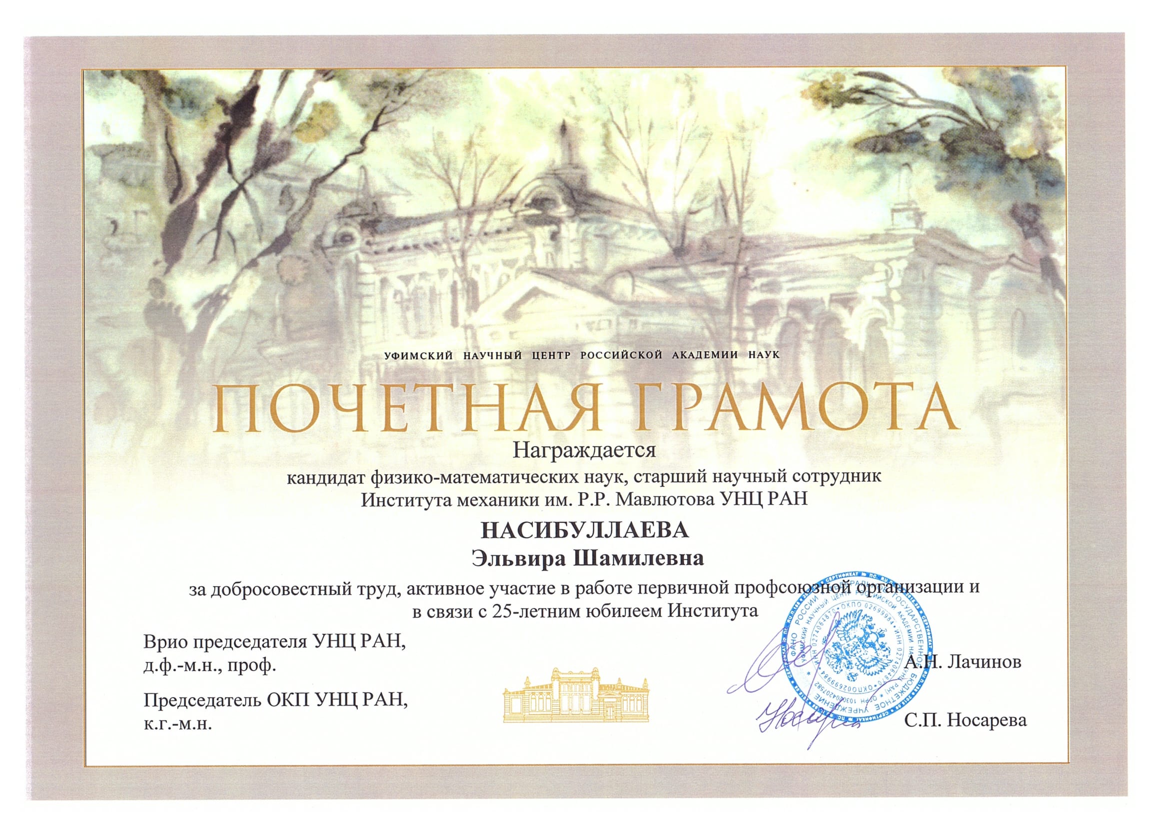 Поздравляем Насибуллаеву Эльвиру Шамилевну с награждением Почетной грамотой Уфимского научного центра Российской академии наук (от 31 мая 2017 года)