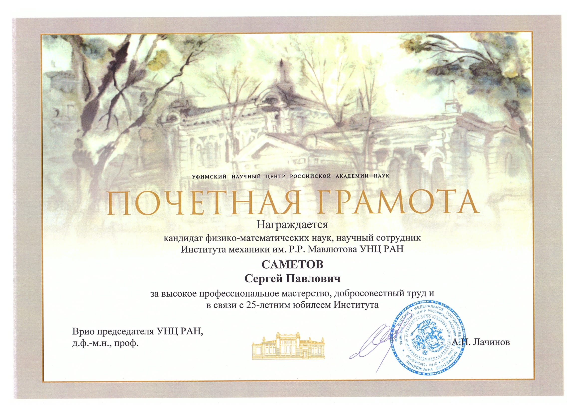 Поздравляем Саметова Сергея Павловича с награждением Почетной грамотой Уфимского научного центра Российской академии наук (от 31 мая 2017 года)
