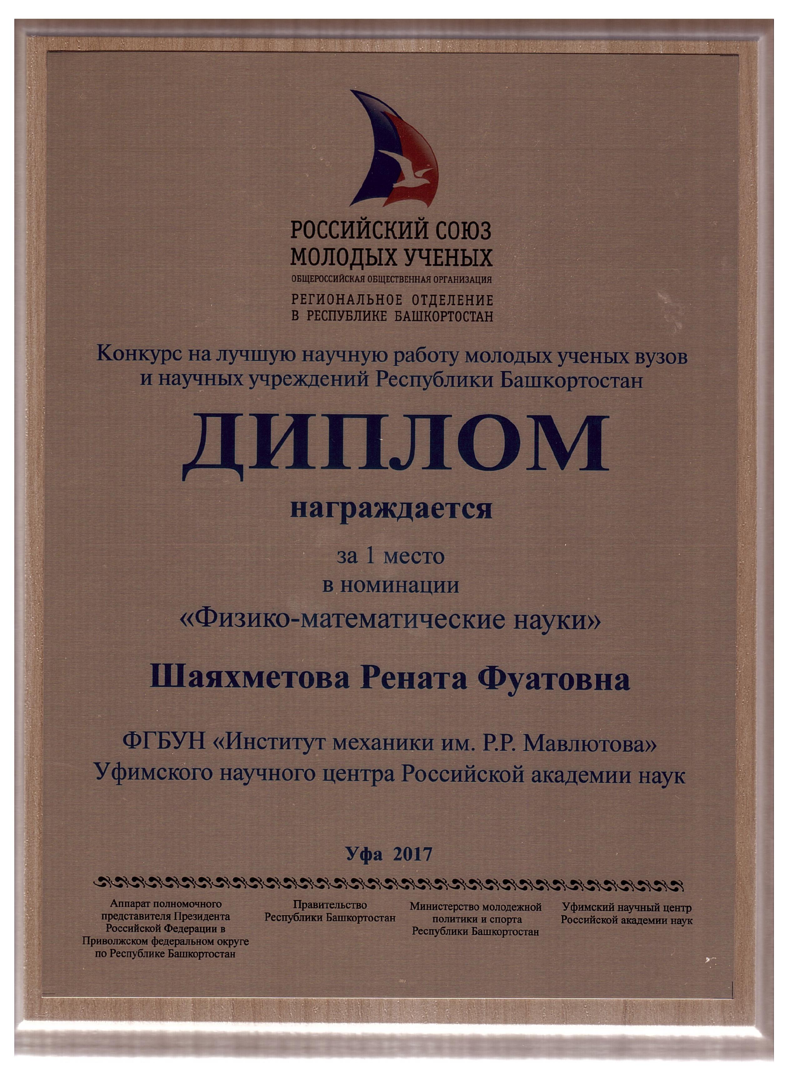 Шаяхметова Рената Фуатовна: Диплом за 1 место в номинации "Физико-математические науки"
