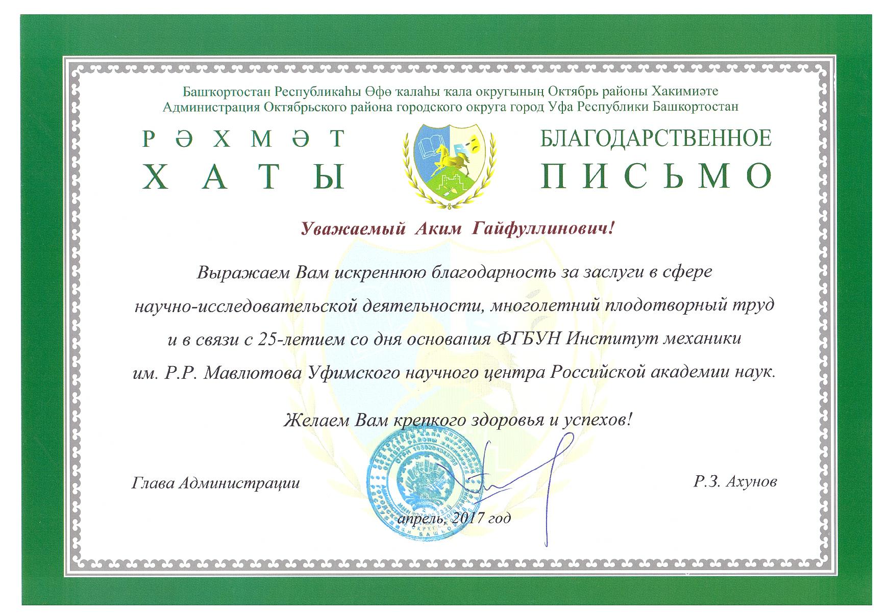 Поздравляем Хакимова Акима Гайфуллиновича с награждением Благодарственным письмом Администрации Октябрьского района городского округа город Уфа Республики Башкортостан (Постановление №368 от 20 апреля 2017 года)