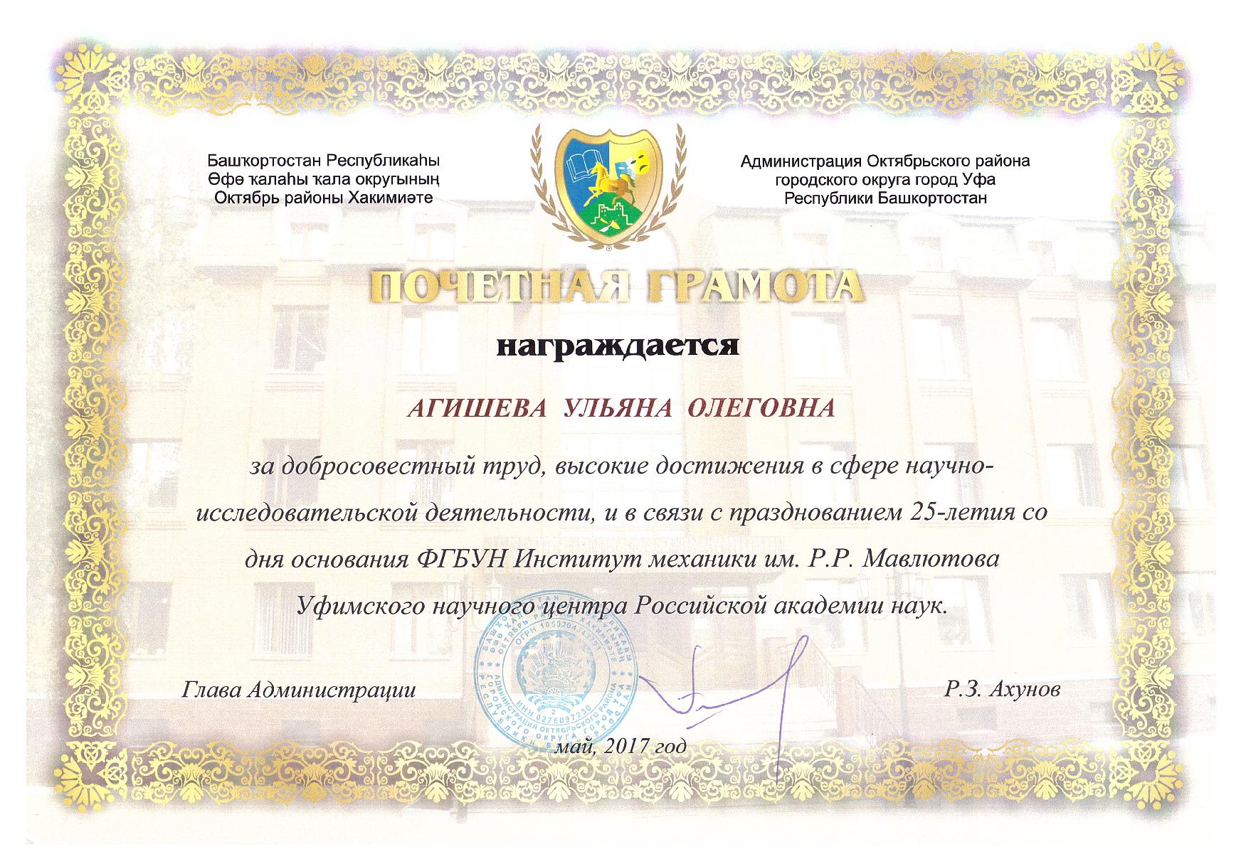 Поздравляем Агишеву Ульяну Олеговну с награждением Почетной грамотой Администрации Октябрьского района городского округа город Уфа Республики Башкортостан (Постановление №463 от 16 мая 2017 года)