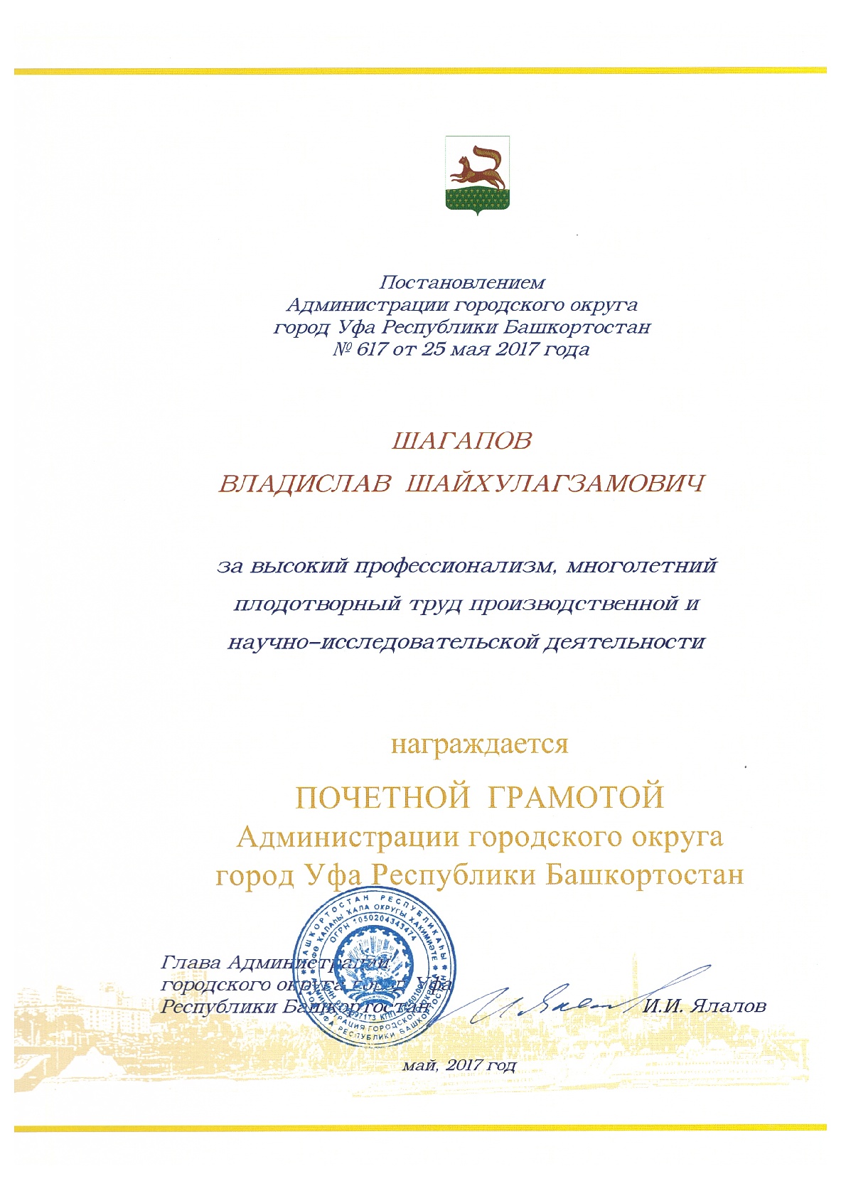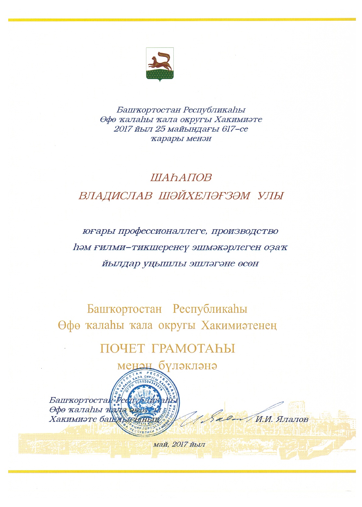 Поздравляем Шагапова Владислава Шайхулагзамовича с награждением Почетной грамотой Администрации городского округа город Уфа Республики Башкортостан (Постановление от 25 мая 2017 года №617)