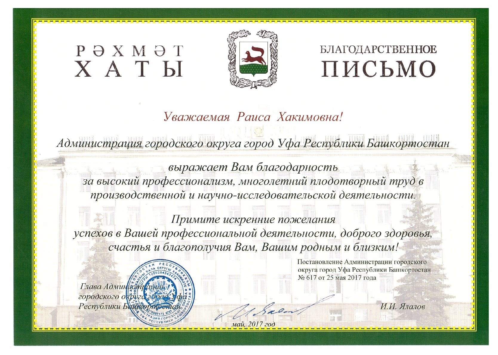 Поздравляем Болотнову Раису Хакимовну с награждением Благодарственным письмом главы Администрации городского округа город Уфа Республики Башкортостан (Постановление от 25 мая 2017 года №617)