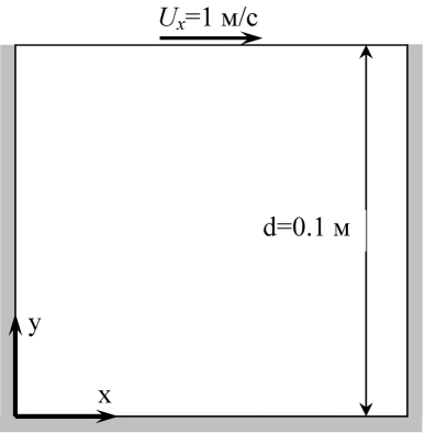 Область состоит из квадрата со стороной 0.1 м, 3 границы которого неподвижны, верхняя граница движется со скоростью Ux=1 м/с. Изучим возможные физические и расчетные случаи решения данной задачи.