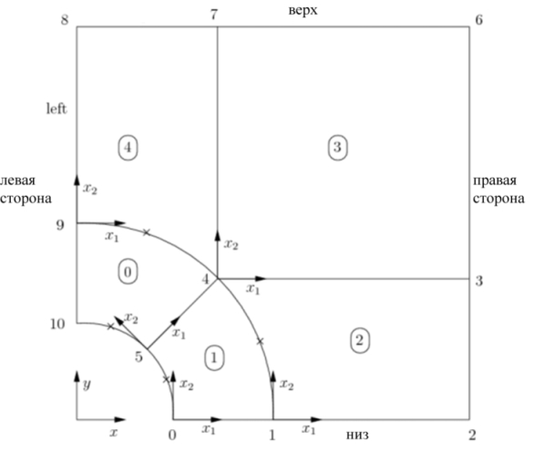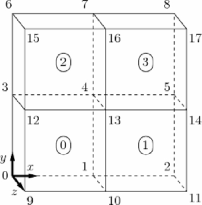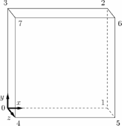 Список блоков, из которых состоит расчетная область. В данной задаче рассматриваем только один блок. Запись состоит из 3 частей. Первая часть состоит из номеров вершин данного блока. Эта часть всегда является шестигранником. Порядок этих номеров показан на рис. 2.2. Вторая запись показывает сколько точек разбиения задается в каждом направлении (направления x, y и z). В частности данная запись задает размерность задачи. Для более точного решения данной задачи можно заменить эту запись на следующую: (40 40 1). При этом шаг по времени должен быть уменьшен в 2 раза (см.ниже). Третья запись задает коэффициент расширения ячейки для каждого направления в блоке. Есть два вида расширения: упрощенный simpleGrading с 3мя параметрами (1, 2, 3), и сложный edgeGrading с параметрами расширения для каждого ребра блока. Значение определяет отношение между начальной и конечной ячейкой на грани. То есть отношение первого интервал к последнему будет равно значению описанному в simpleGrading или edgeGrading. Например, записи simpleGrading (1 2 3) и edgeGrading (1 1 1 1 2 2 2 2 3 3 3 3) будут равнозначными.